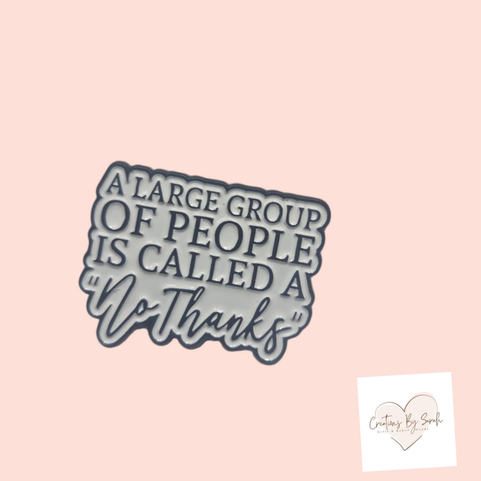 This pin badge humorously declares that a large group of people is called a "No Thanks," making it an ideal accessory for those who embrace their anti-social side. Crafted with sharp wit, it’s perfect for anyone who prefers solitude or enjoys lightheartedly expressing their social preferences. Durable and eye-catching, this badge adds a clever touch to jackets, bags, or hats while sparking smiles and nods of understanding from like-minded friends.