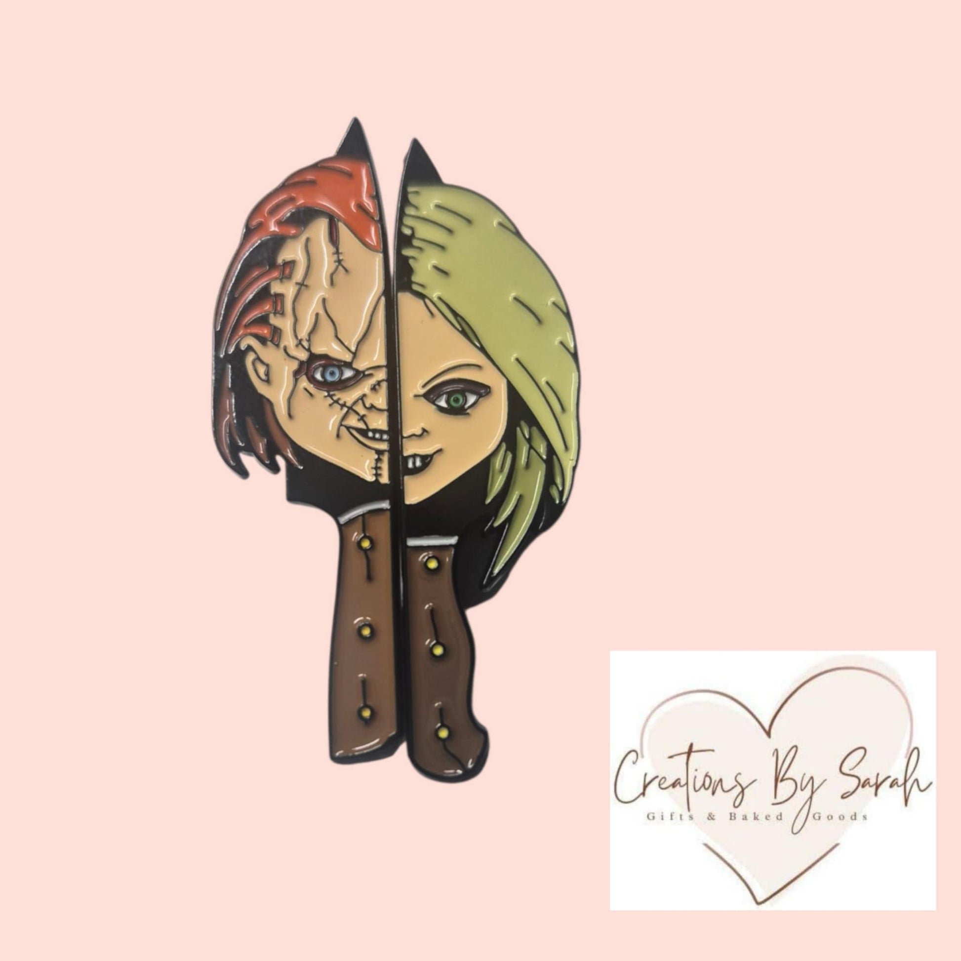 This set features two expertly crafted enamel pin badges, each shaped like a knife and showcasing detailed portraits of iconic characters Chucky and Tiffany. The sharp knife design highlights the sinister charm of these figures, making them a perfect collectible for horror enthusiasts. Durable and vibrant, these pins add a distinctive edge to any pin collection or outfit.